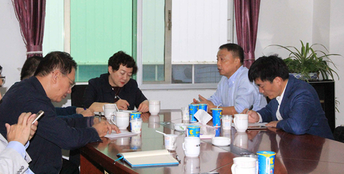 蔡永康董事長(右二)向中國奶協秘書長劉亞清(右三)、副秘書長周振峰(右一)等領導匯報企業近年發展情況