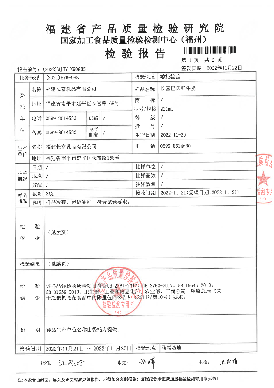 長富牛奶2022年11月20日省質檢院冷鏈檢測報告