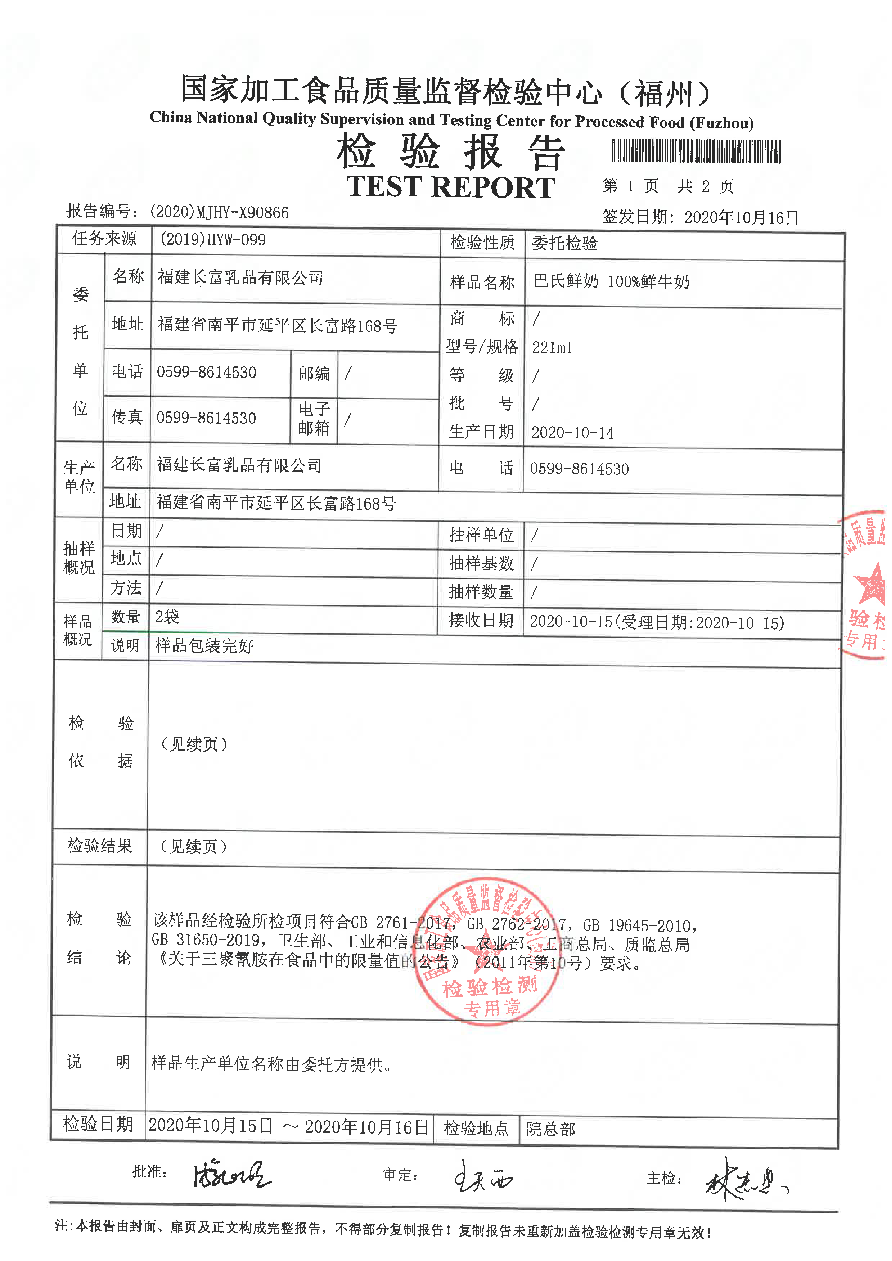 長富牛奶2020年10月14日質(zhì)檢所冷鏈檢測報告