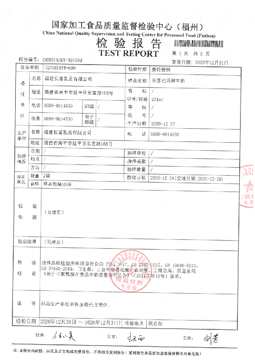 長富牛奶2020年12月26日質(zhì)檢所冷鏈檢測報告
