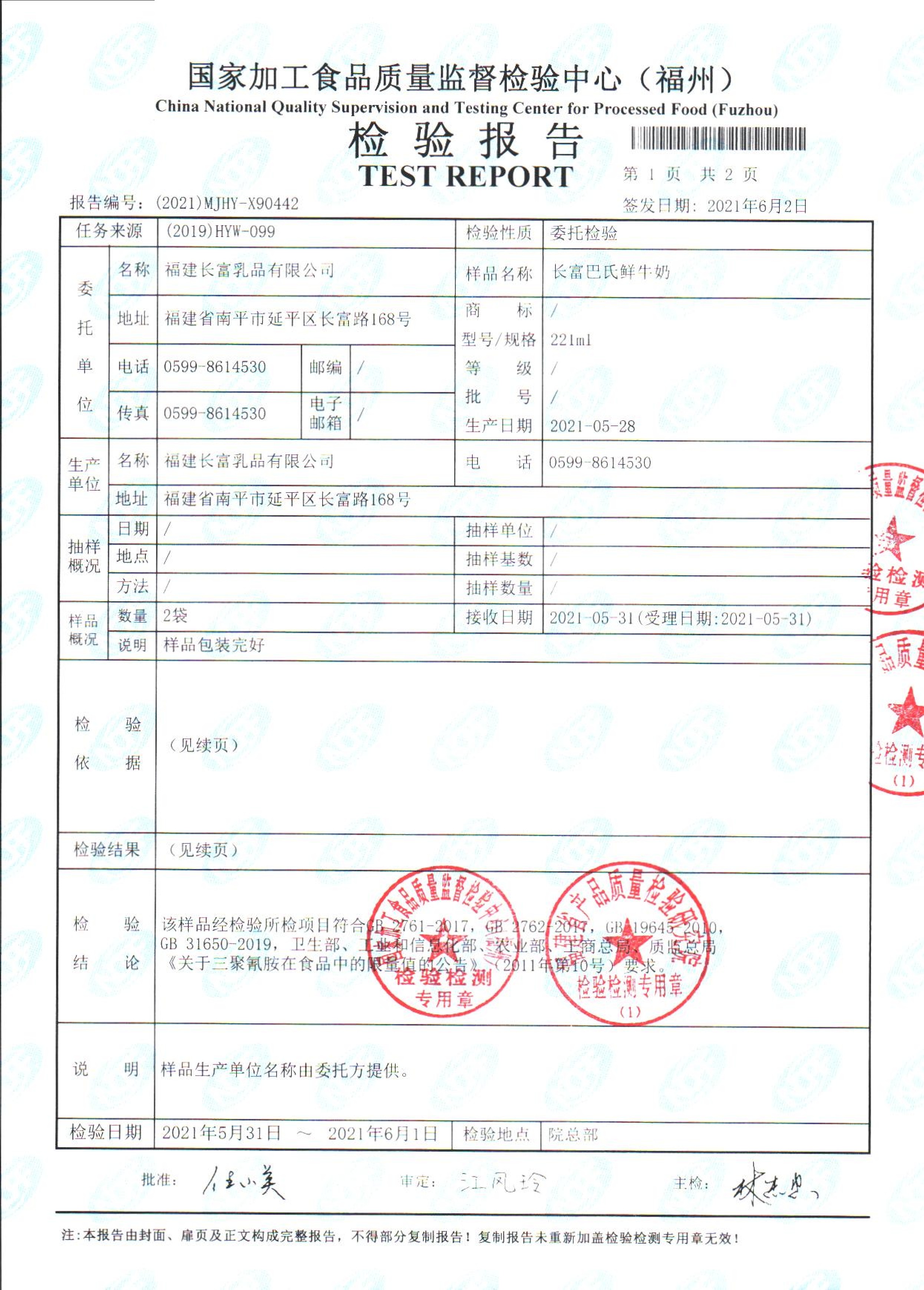 長富牛奶2021年5月28日質(zhì)檢所冷鏈檢測報告