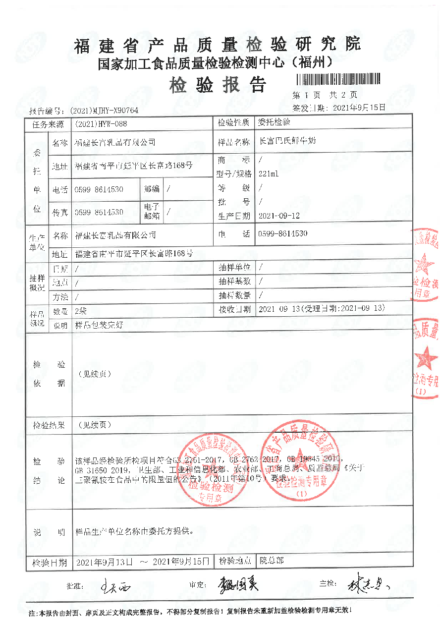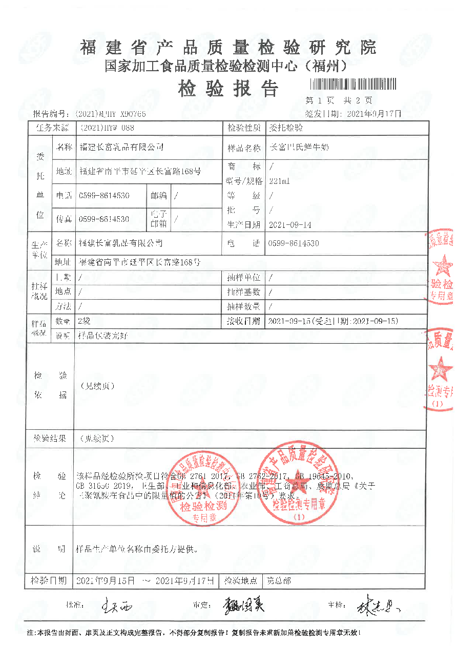 長富牛奶2021年9月14日質(zhì)檢所冷鏈檢測報告