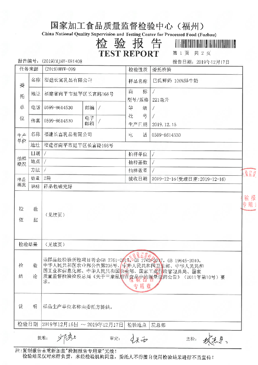 長富牛奶2019年12月15日質檢所冷鏈檢測報告