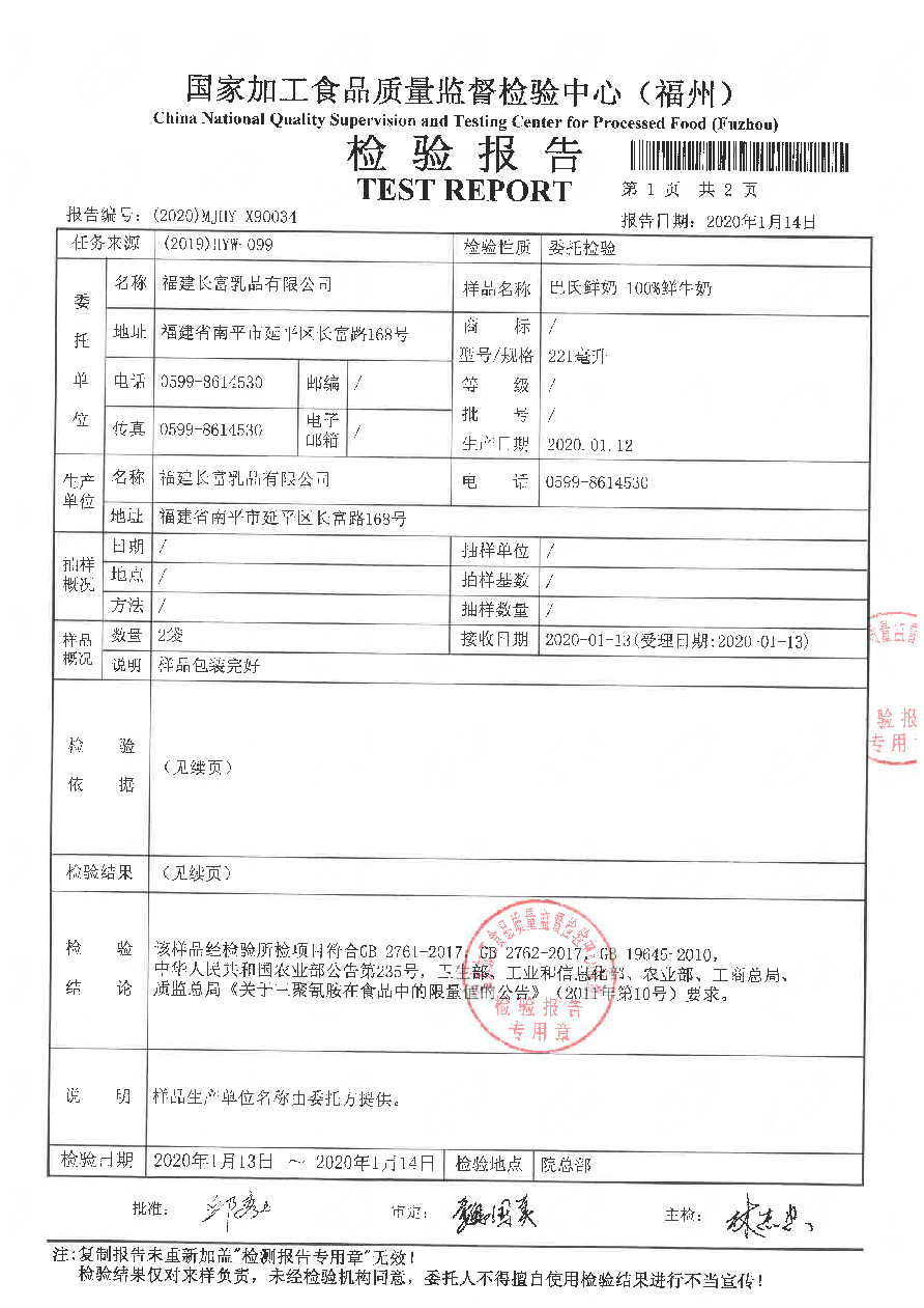 長富牛奶2020年1月12日質檢所冷鏈檢測報告