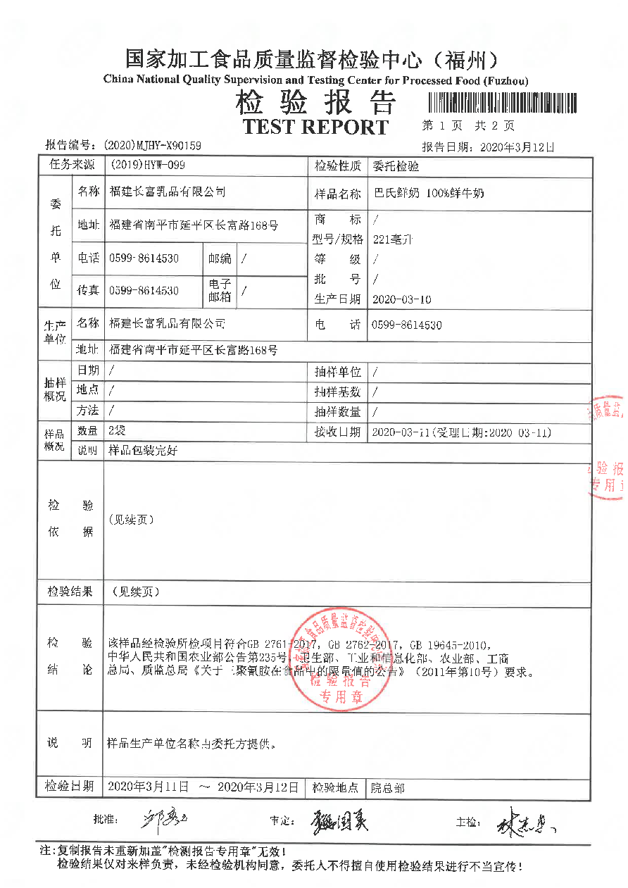 長富牛奶2020年3月10日質檢所冷鏈檢測報告