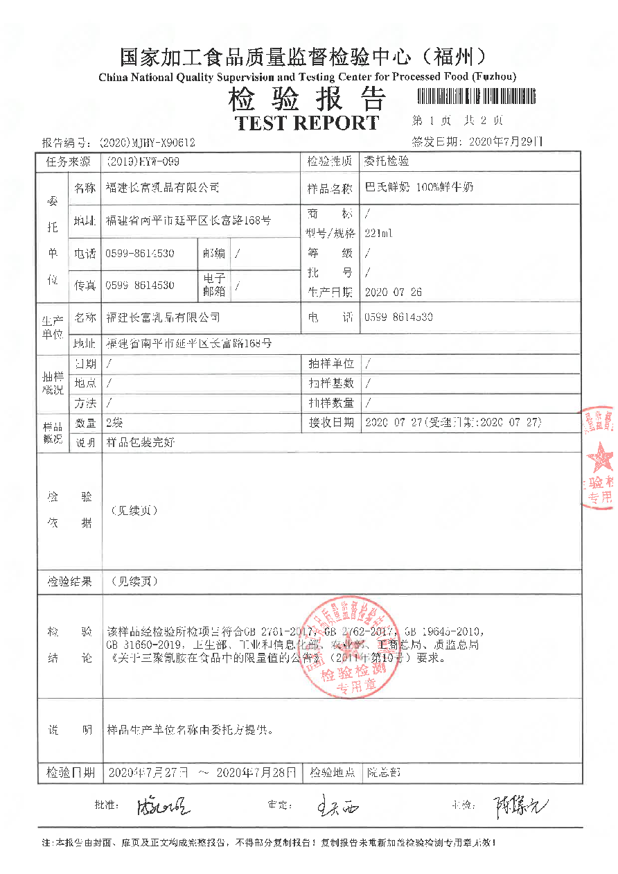 長富牛奶2020年7月26日質檢所冷鏈檢測報告