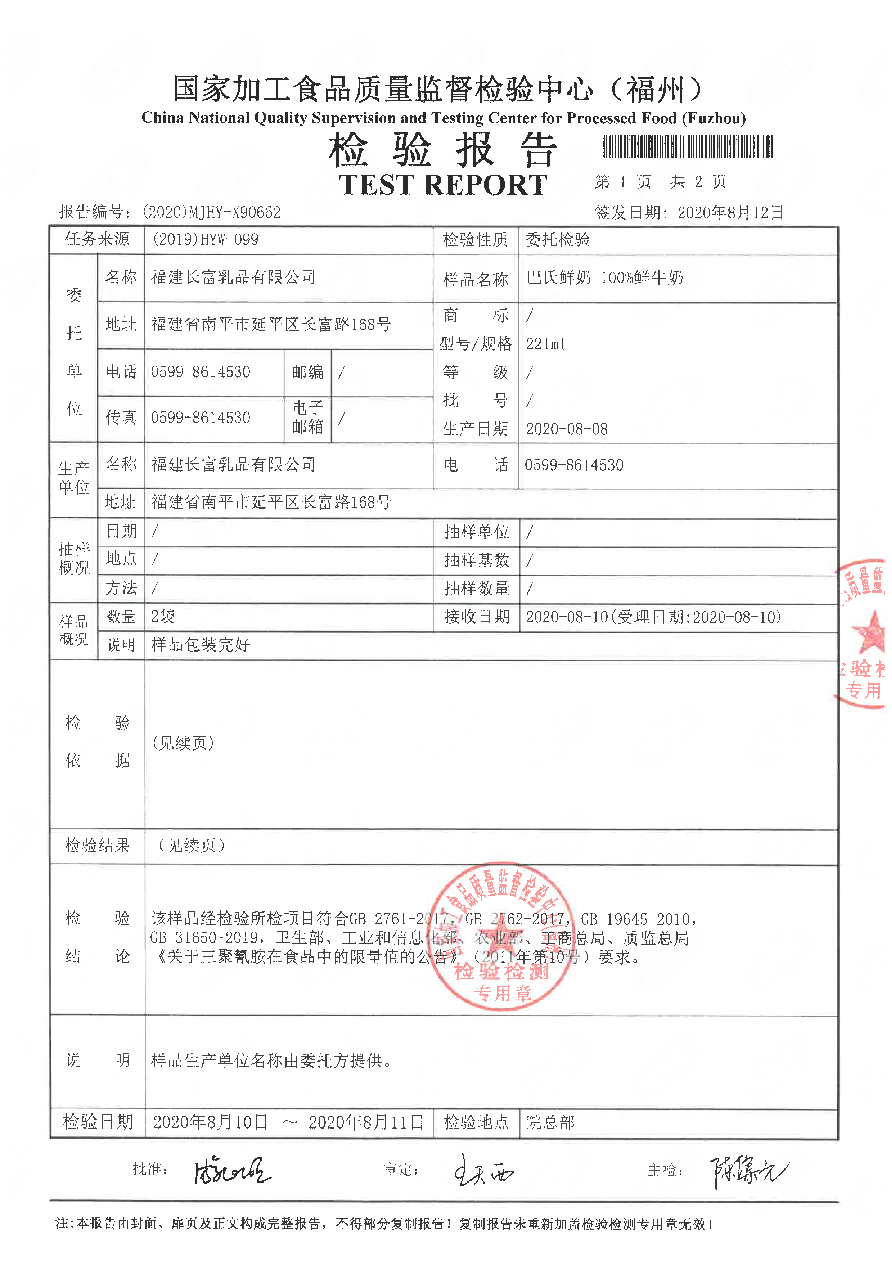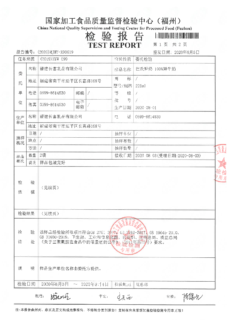 長富牛奶2020年8月1日質檢所冷鏈檢測報告