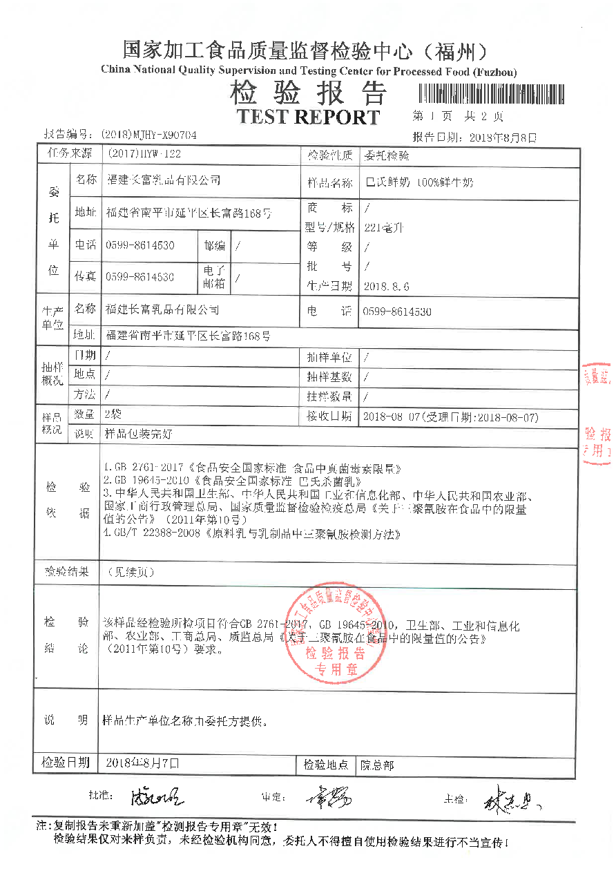 長富牛奶2018年8月6日質檢所冷鏈檢測報告
