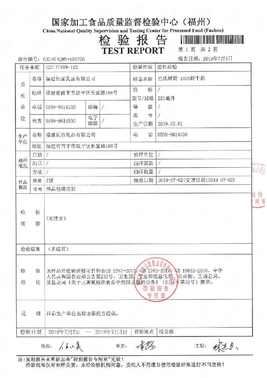 長富牛奶2019年7月1日質檢所冷鏈檢測報告