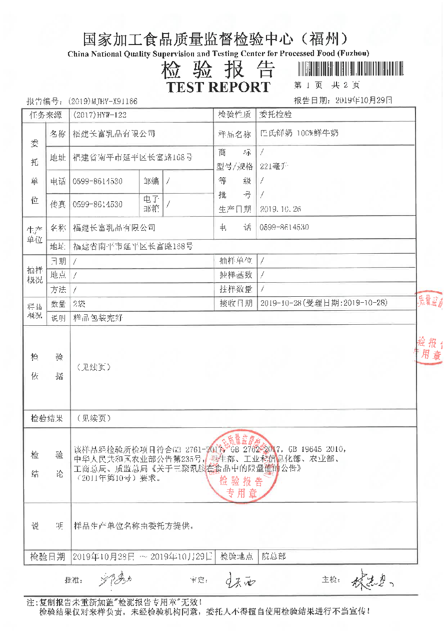 長富牛奶2019年10月26日質檢所冷鏈檢測報告