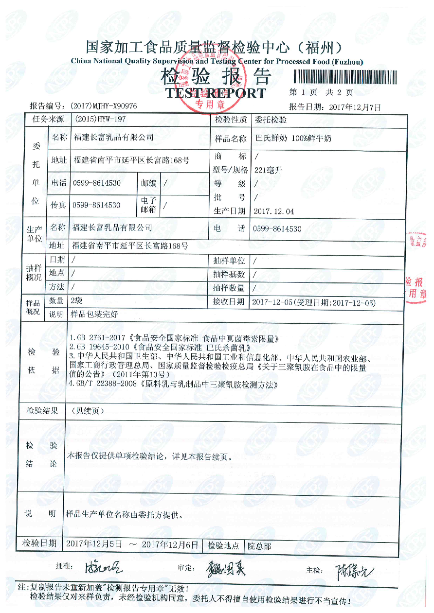 長富牛奶2017年12月6日質(zhì)檢所冷鏈檢測報告