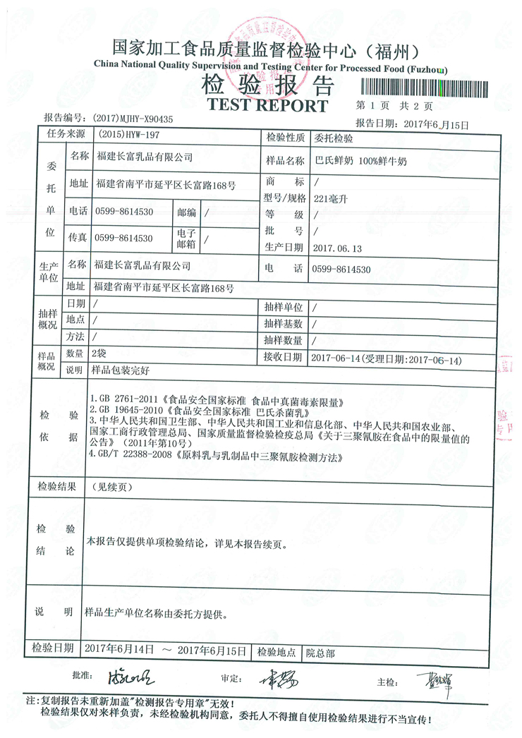 長(zhǎng)富牛奶2017年6月14日質(zhì)檢所冷鏈檢測(cè)報(bào)告