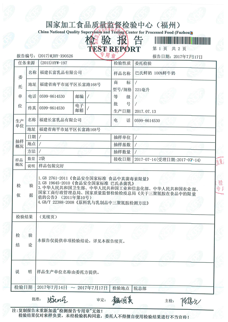 長(zhǎng)富牛奶2017年7月13日質(zhì)檢所冷鏈檢測(cè)報(bào)告