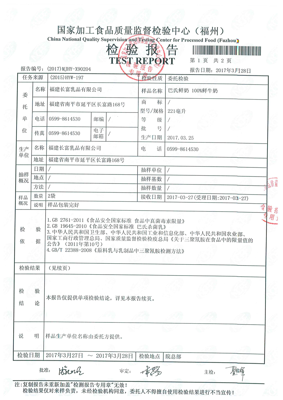 長(zhǎng)富牛奶2017年3月25日質(zhì)檢所冷鏈檢測(cè)報(bào)告