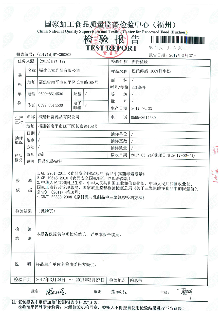 長(zhǎng)富牛奶2017年3月23日質(zhì)檢所冷鏈檢測(cè)報(bào)告