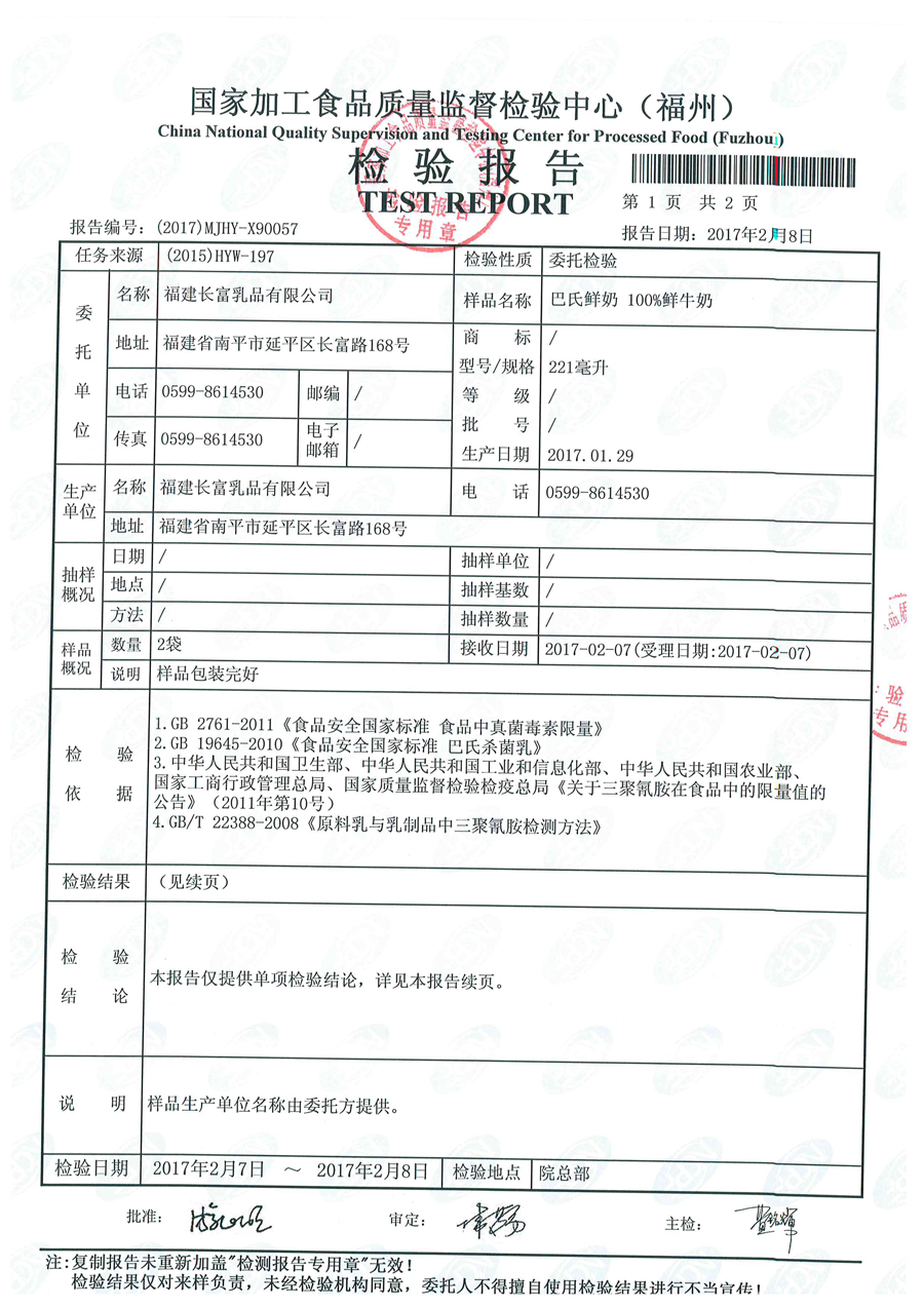 長(zhǎng)富牛奶2017年1月29日質(zhì)檢所冷鏈檢測(cè)報(bào)告