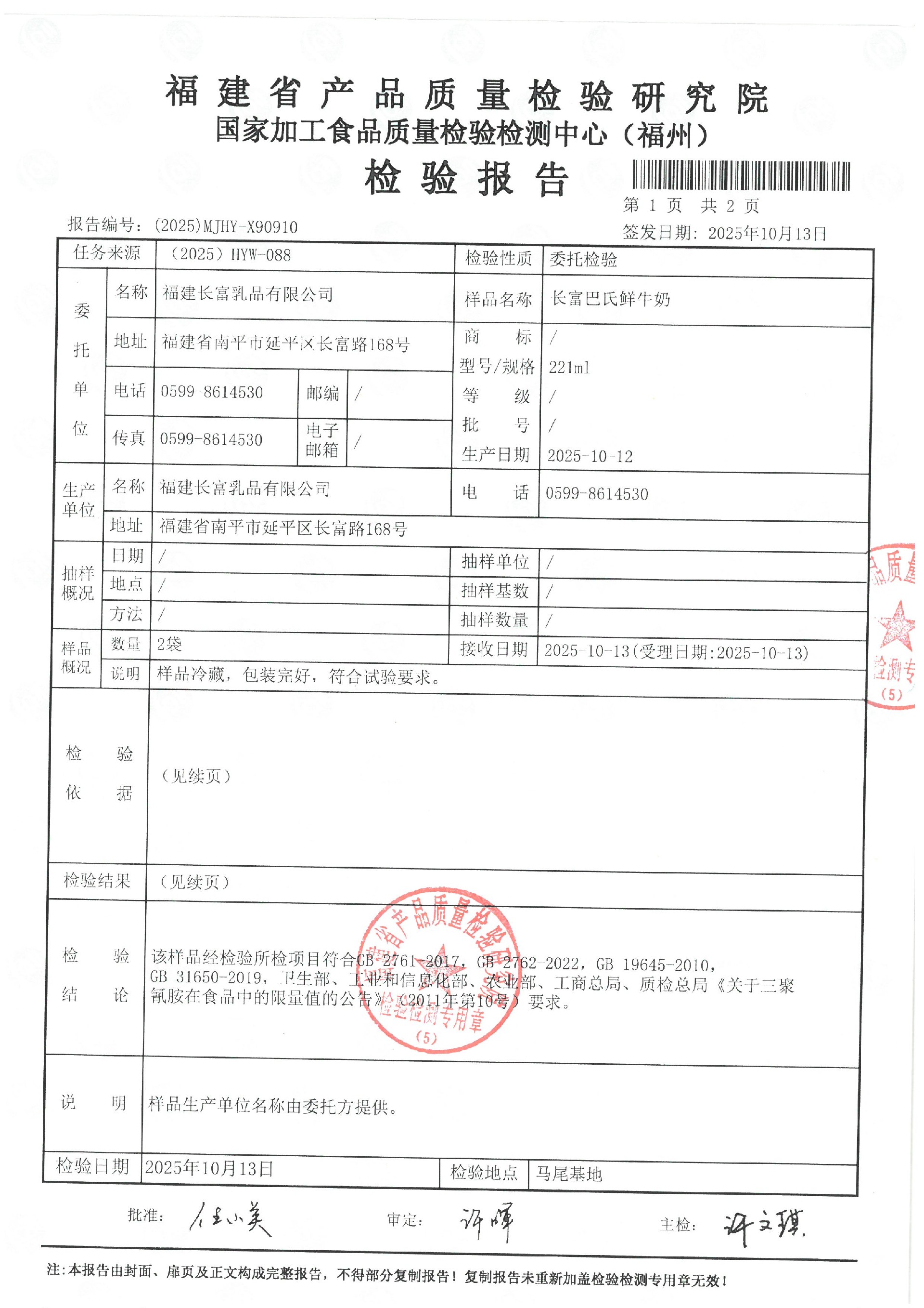 more長富牛奶2025年10月13日省質檢院冷鏈檢測報告