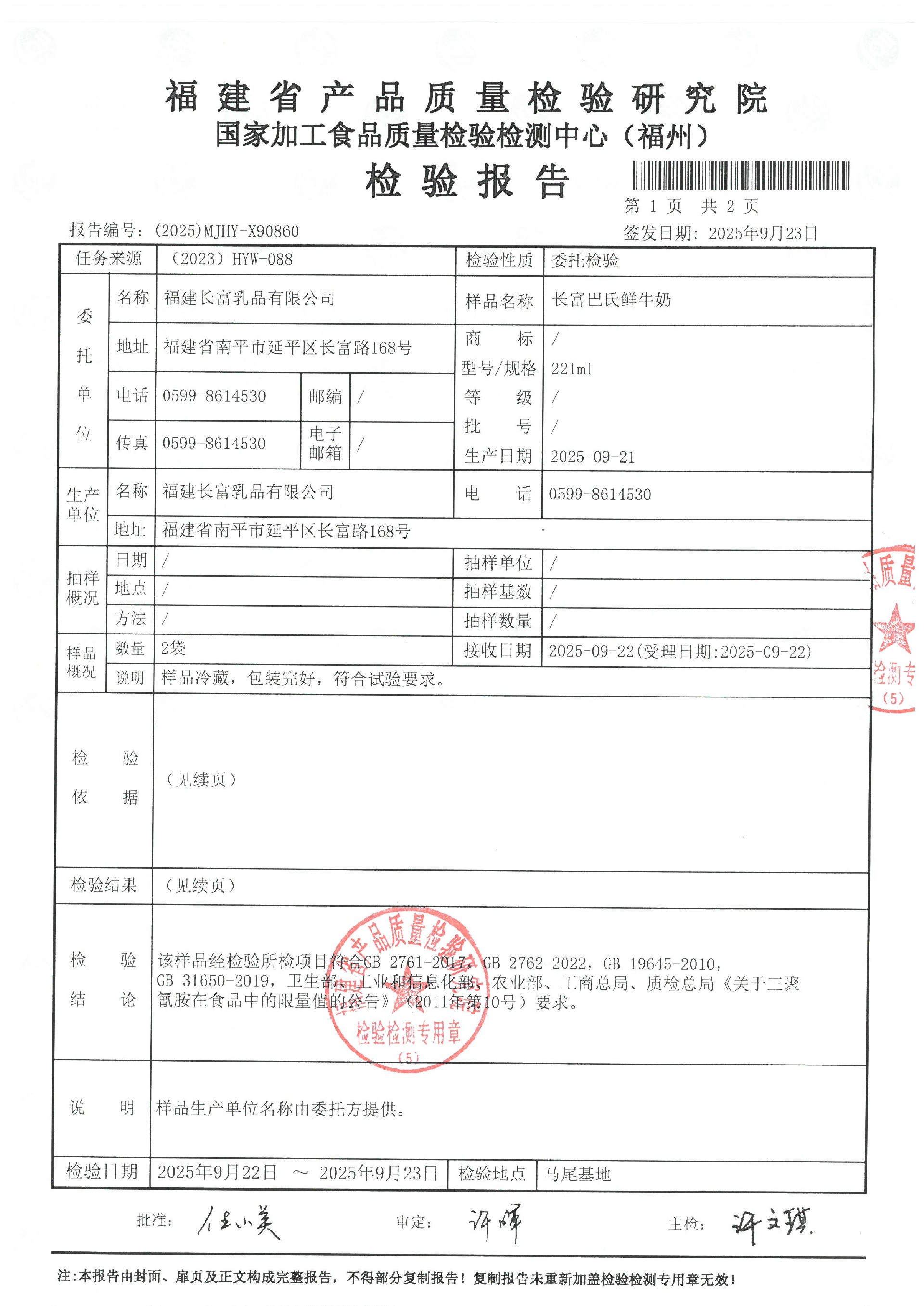 more長富牛奶2025年9月21日省質檢院冷鏈檢測報告