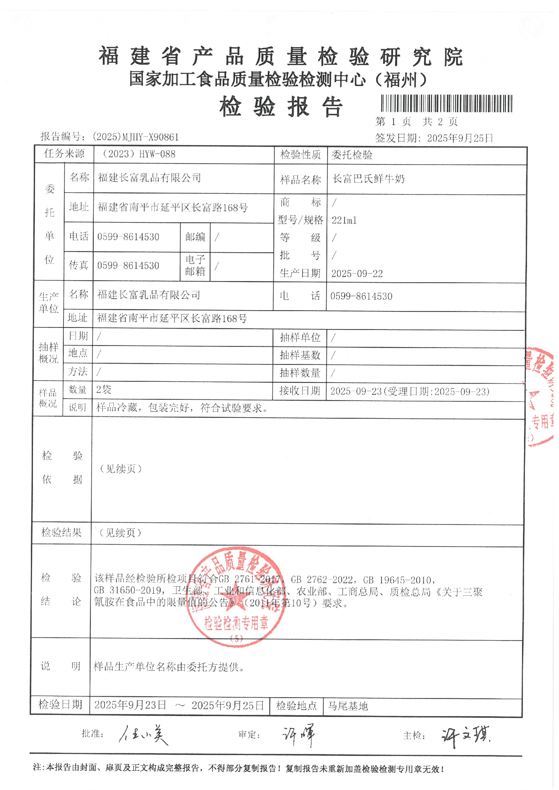 more長富牛奶2025年9月22日省質檢院冷鏈檢測報告