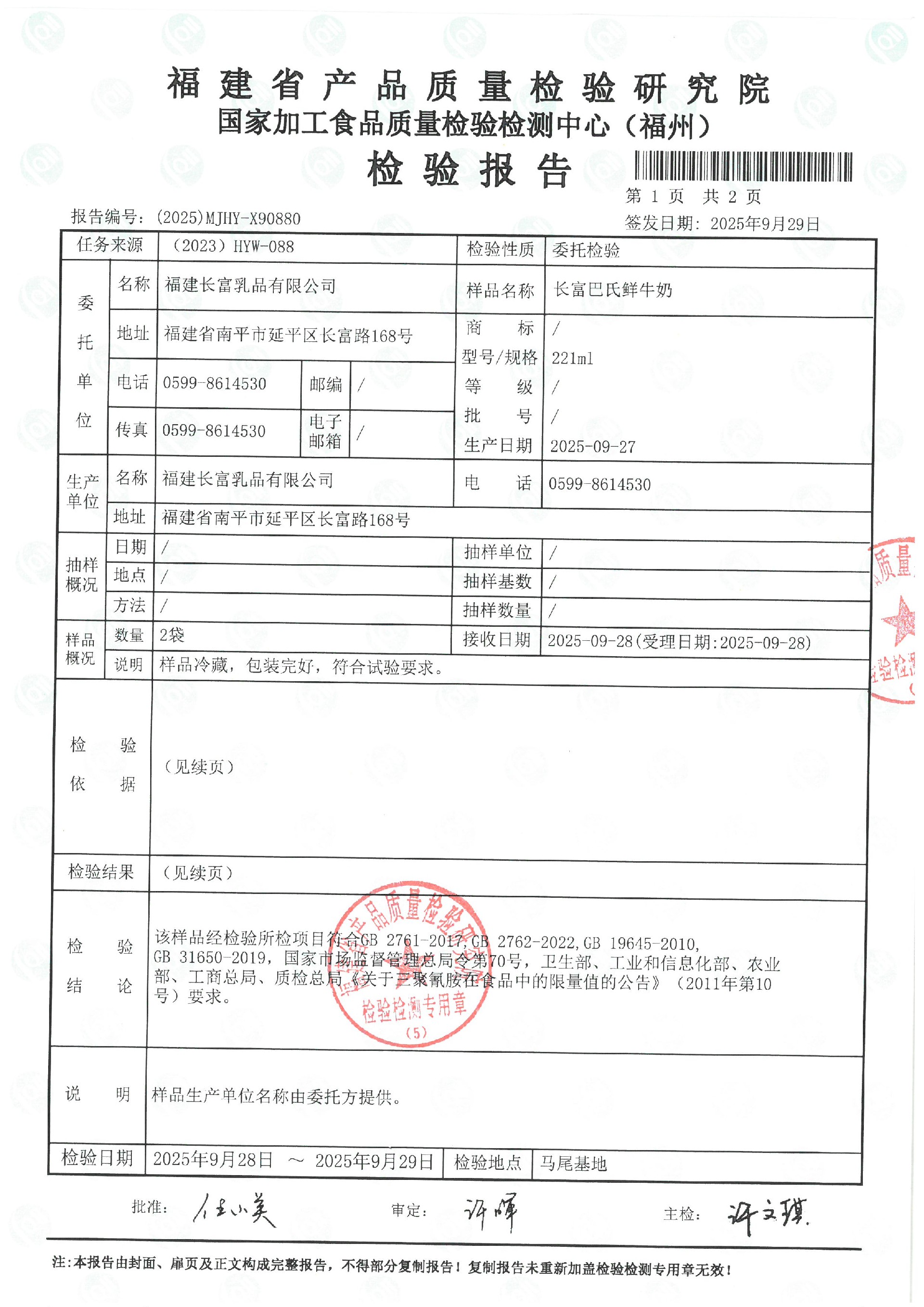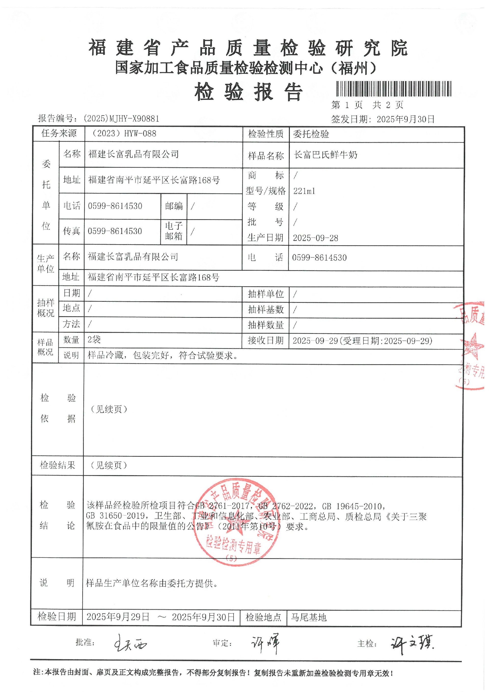 more長富牛奶2025年9月27日省質檢院冷鏈檢測報告