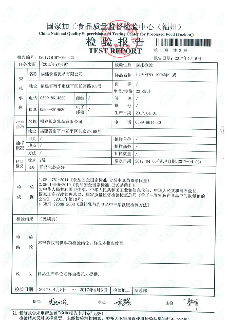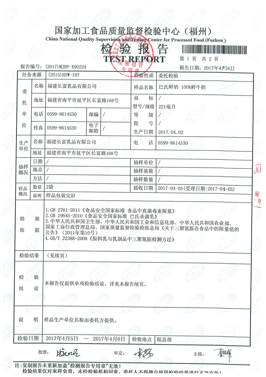 more長富牛奶2017年4月1日質檢所冷鏈檢測報告