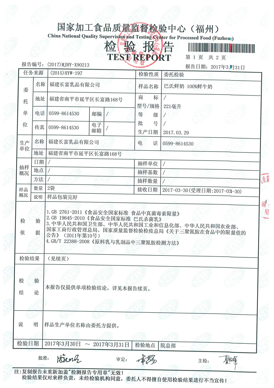 more長富牛奶2017年3月31日質檢所冷鏈檢測報告
