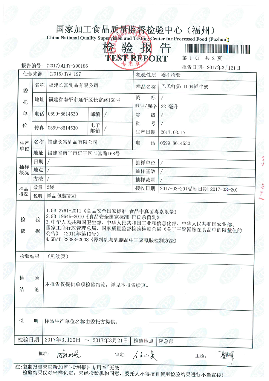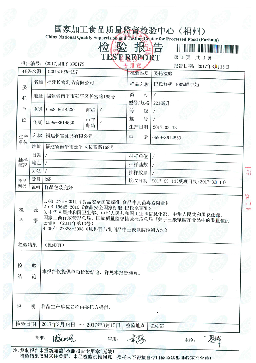more長富牛奶2017年3月17日質檢所冷鏈檢測報告