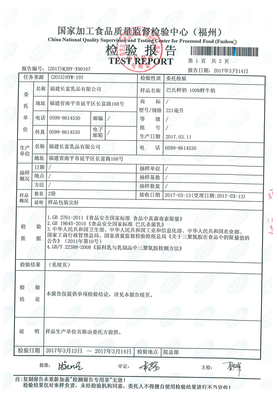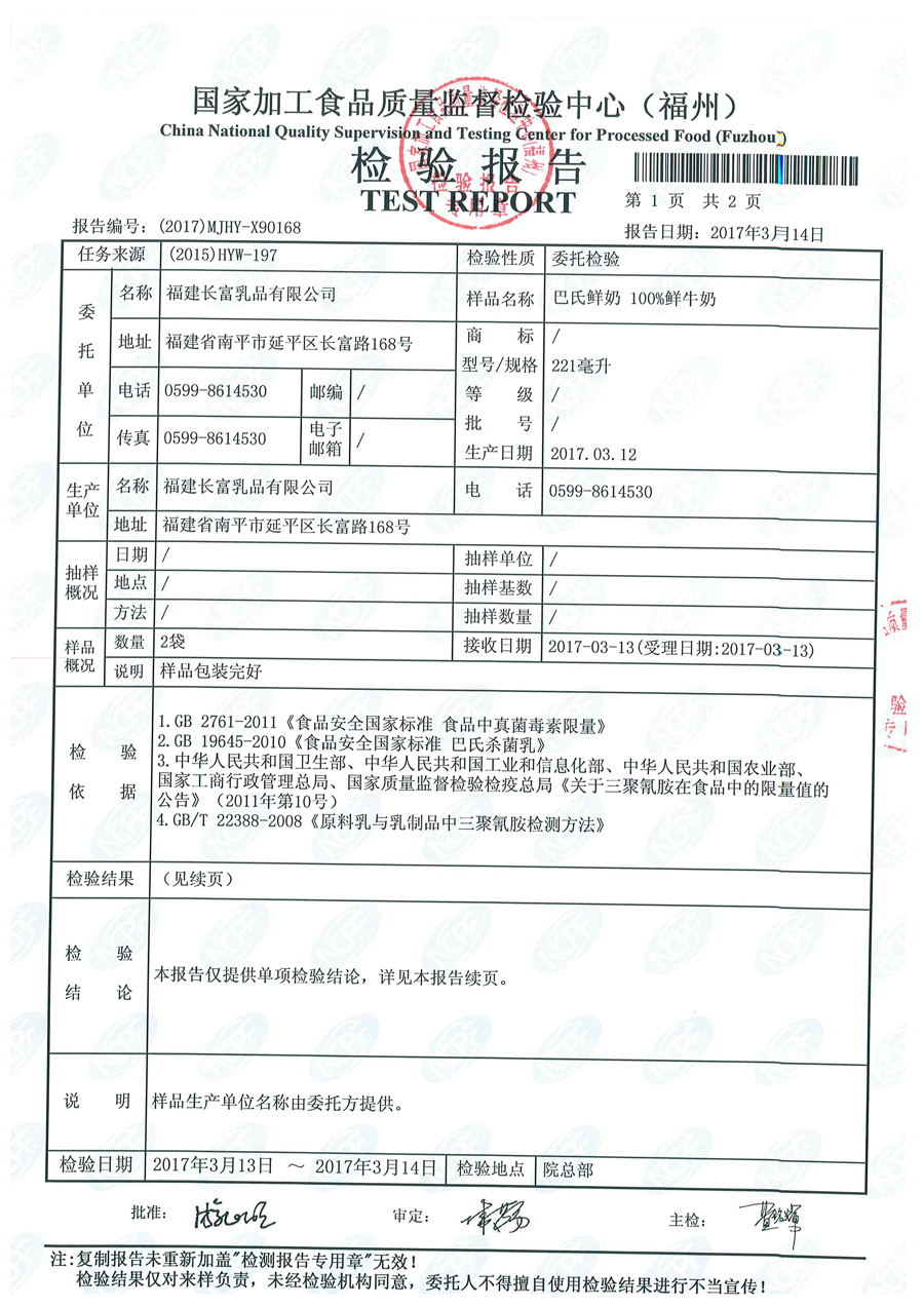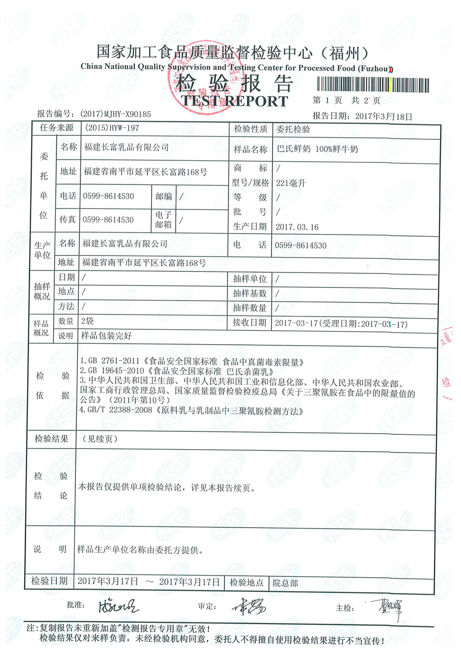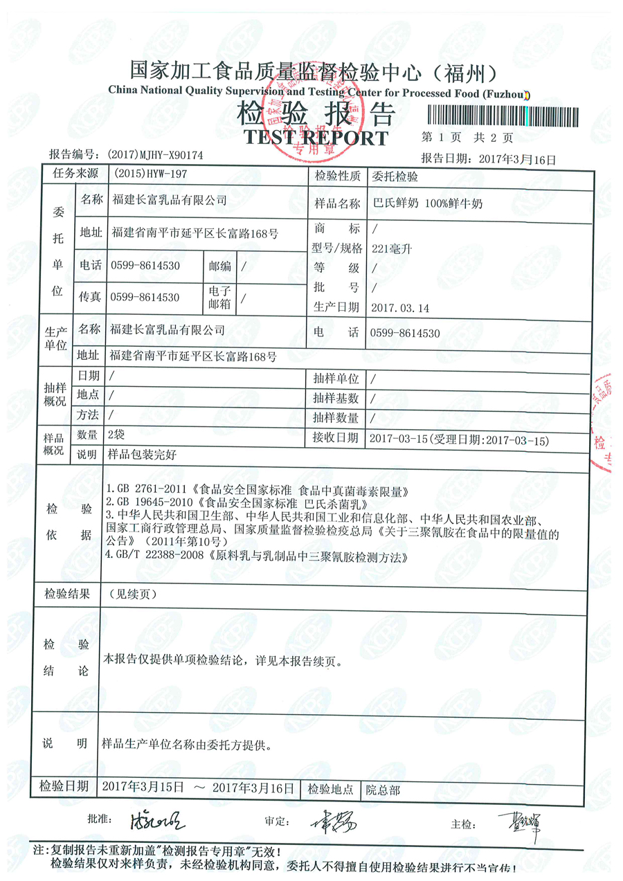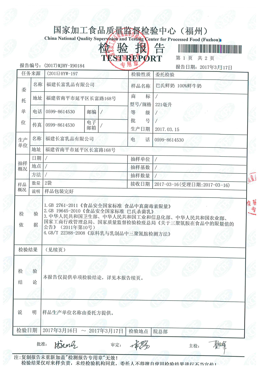 more長富牛奶2017年3月16日質檢所冷鏈檢測報告
