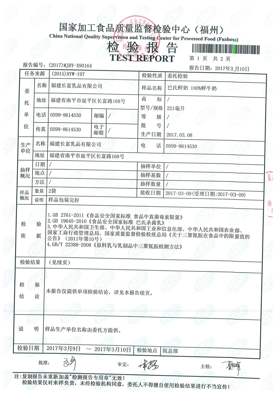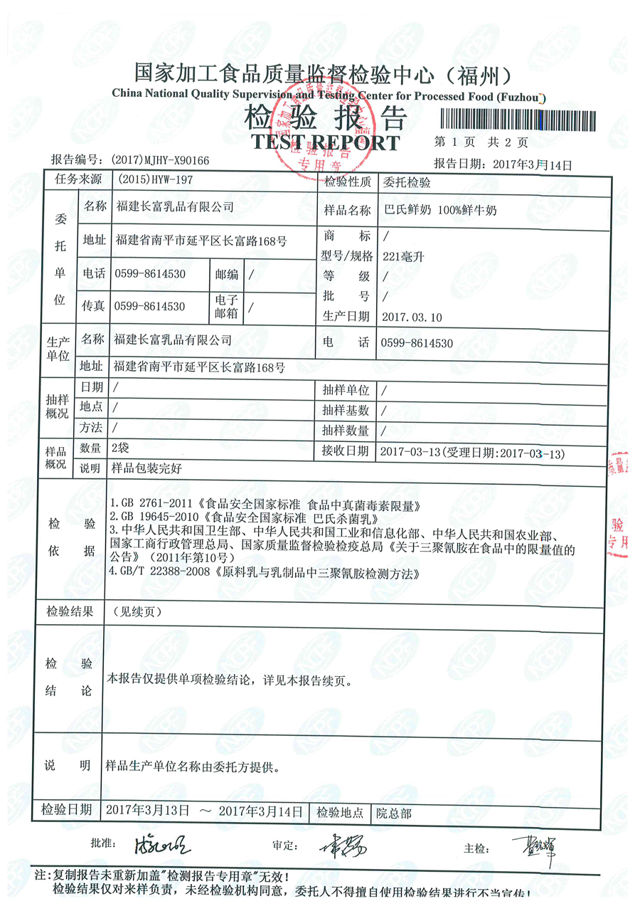 more長富牛奶2017年3月8日質檢所冷鏈檢測報告