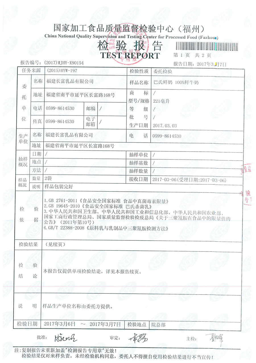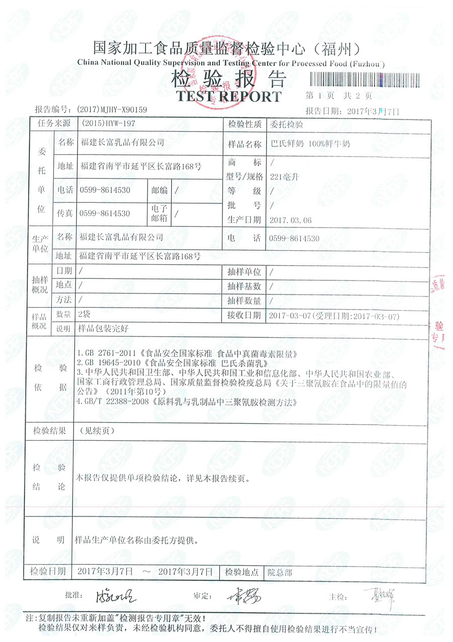 more長富牛奶2017年3月7日質檢所冷鏈檢測報告