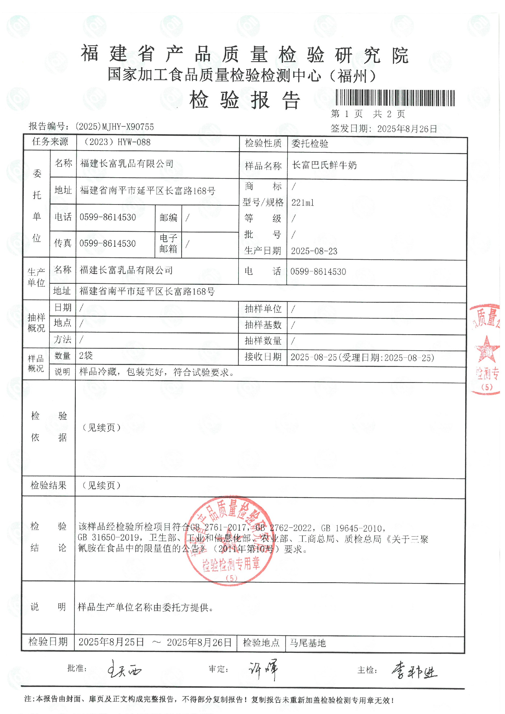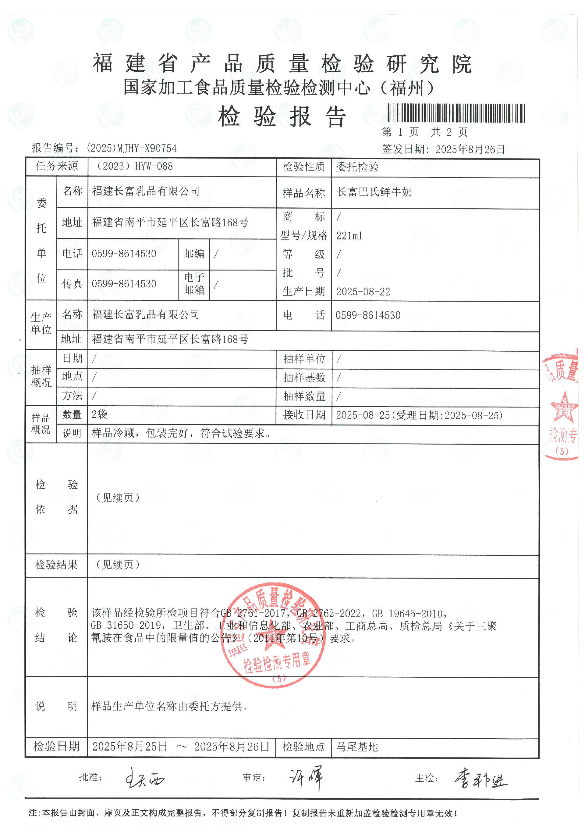 more長富牛奶2025年8月26日省質(zhì)檢院冷鏈檢測報告