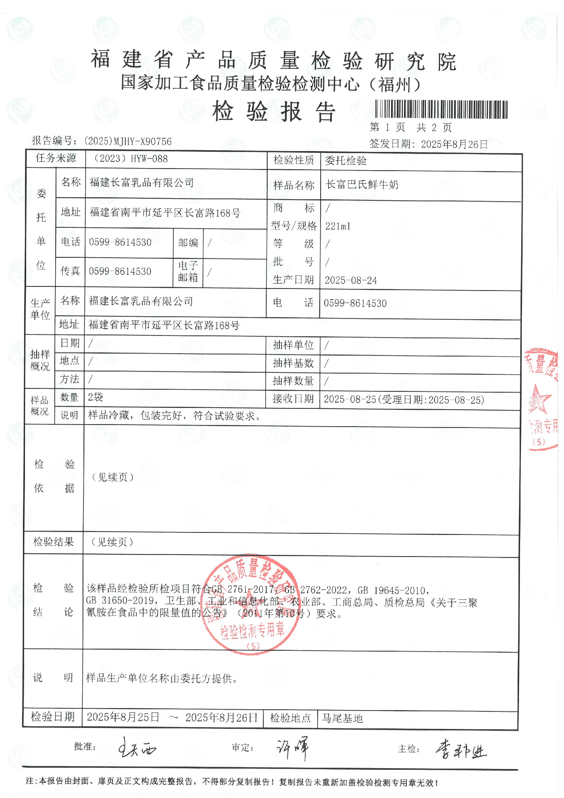 more長富牛奶2025年8月24日省質(zhì)檢院冷鏈檢測報告