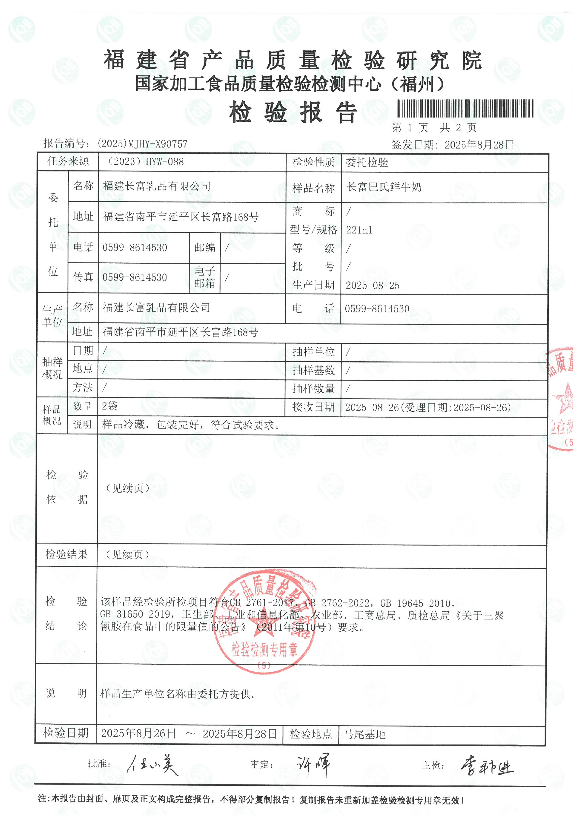 more長富牛奶2025年8月27日省質(zhì)檢院冷鏈檢測報告